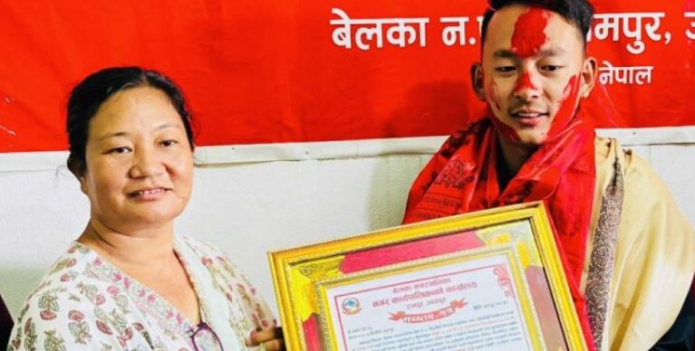 पूर्णपुष्टि, भदौ १ । उदयपुरको बेलका नगरपालिकाले लेबुचे हिमाल र आईल्याण्ड पिकको सफल आरोहण गरेका एक युवकलाई सम्मान गरेको छ । बेलका–७ का जलन राईले ६ हजार १ सय १९ मिटर लेबुचे र ६ हजार १ सय ८९ मिटरको पिक सफलतापूर्वक आरोहण गरेपछि उनलाई नगरपालिकाकी उप–प्रमुख जिरा राईले एक कार्यक्रमबीच शुक्रबार सम्मान गरेको हो ।