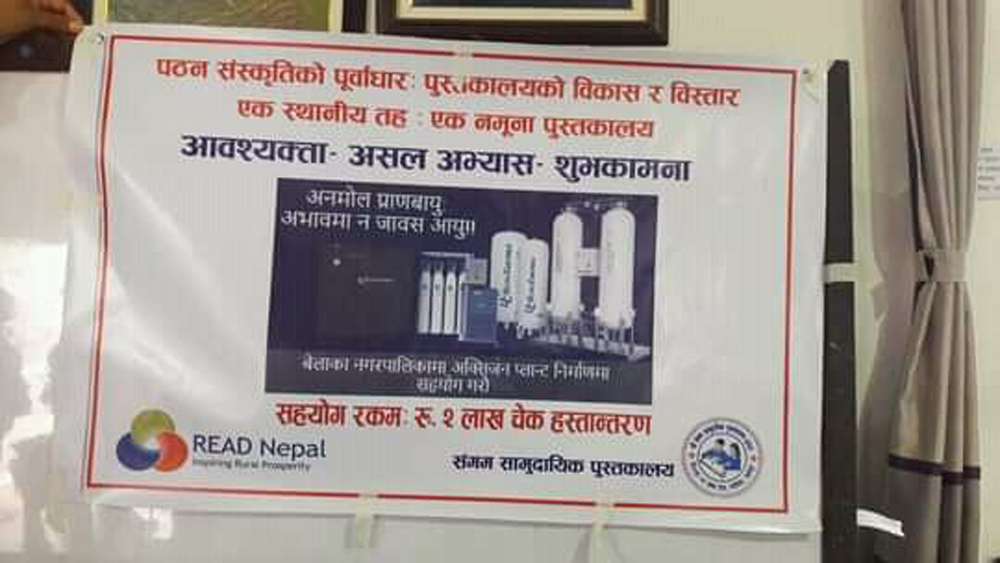 बेलकाको अक्सिजन प्लान्टलाई संगम पुस्तकालय र रिड नेपालको २ लाख आर्थिक सहयोग