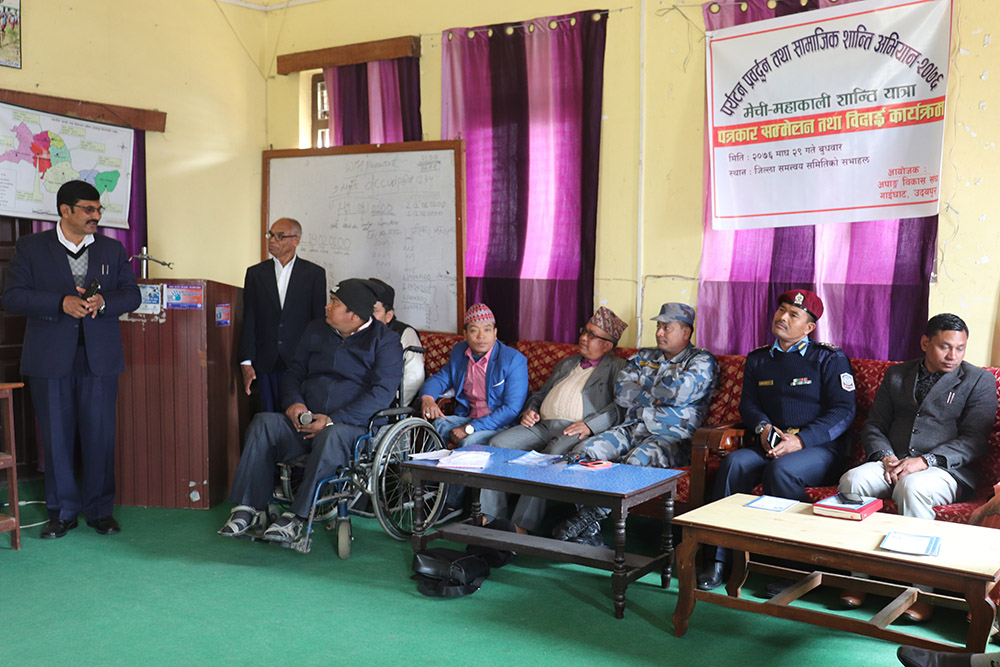 पर्यटन प्रवद्र्धन तथा सामाजिक शान्ति अभियान २०७६ लाई सफल बनाउने भन्दै शारिर अपाङगता भएका नारायणभक्त कार्की अहिले मेचि महाकाली शान्ति यात्राको दौरानमा हुनुहुन्छ । पर्यटन बर्ष २०२० लाई सफल पार्ने भन्दै राष्ट्रको निमित्त आफु यस अभियान हिडिरहेको उहाँको भनाई छ । उनलाई अपाङग विकास संघ उदयपुरले जिल्ला समन्वय समितिको हलमा पत्रकार सम्मेलन गरी बुधबार सफल यात्रको विदाई गरेको छ ।