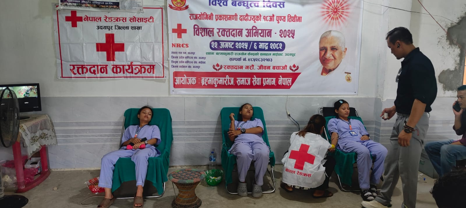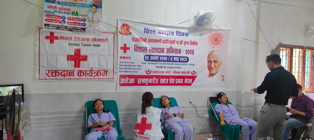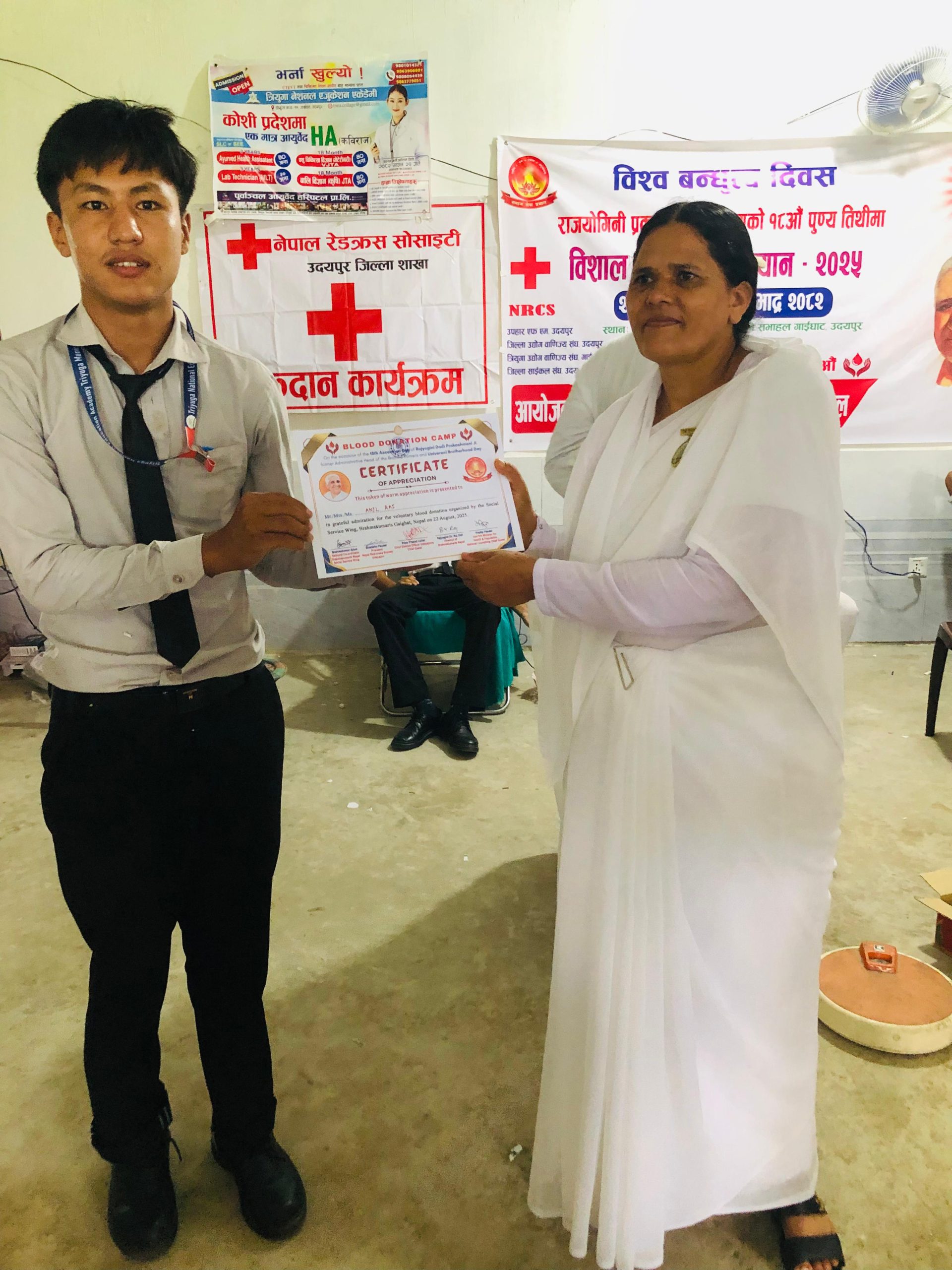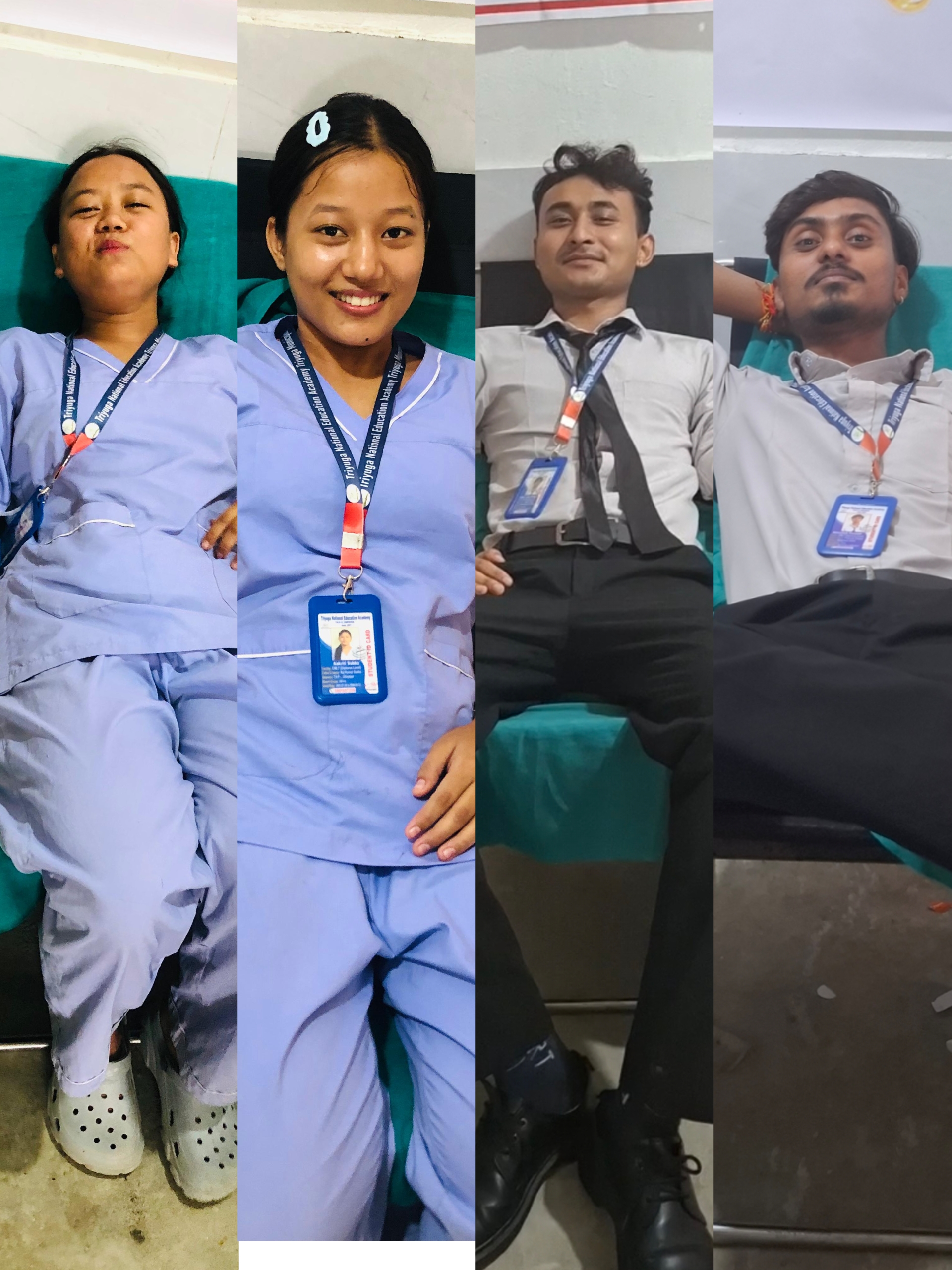 त्रियुगा नेशनल एकेडेमी गाईघाटका विद्यार्थीहरुले रक्तदान गरेको छ । “रक्तदान महाअभियान तपाईको रगत जिवनको वरदान ” भन्ने नाराका साथ ब्रह्राकुमारी राजयोग सेवा केन्द्र गाईघाटले आयोजना गरेको रक्तदान अभियानमा विद्यार्थीहरुले रगत प्रदान गरेको हो । शुक्रबार राधाकृष्ण मन्दीर मुनि रहेका सेवा केन्द्रकै भवनमा करिब १० भन्दा बढी विद्यार्थीहरुले रक्तदान कार्यक्रममा सहभागी जनाएको हो । स्वास्थ्य सँगै सम्बन्धित बिषयहरुमै अध्यानरत विद्यार्थीहरुले रगतको महत्वलाई ध्यानमा राखी रक्तदान गरेको थियो । त्रियुगा नेशनल एकेडेमीले बिषेशगरी स्वास्थ्य सँग सम्बन्धित प्राविधिक शिक्षा अध्यापन गराउँदै आएको छ । जस अन्तर्गत ३ बर्षे ल्याव टेक्निसियन, ३ बर्षे ए.एच.ए (कविराज), १८ महिने पशु चिकित्सा विज्ञान भेटेरीनरी र बाली बिज्ञान कृषि १८ महिने गरी ४ ओटा कोर्षहरु संञ्चालन गरिरहेको छ । विश्व बन्धुत्व दिवस तथा राजयोगिनी प्रकाशमणी दादीज्यूको १८ औँ पुण्य तिथिमा रक्तदान महाअभियानको पहिलो दिनमा विद्यार्थीहरुले रक्तादान गरेको हो ।