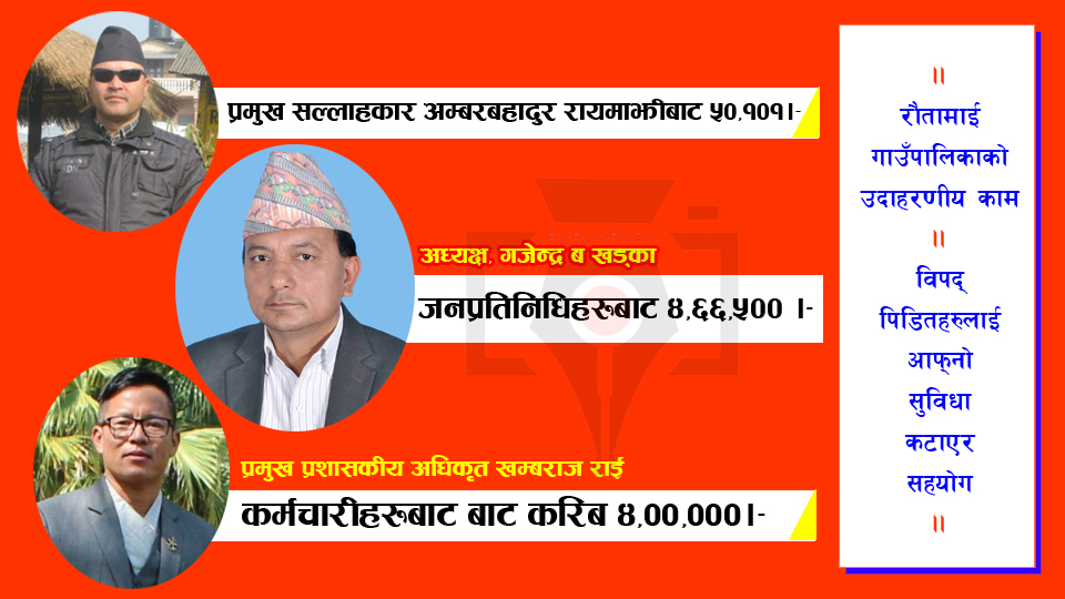 उदयपुरको रौतामाई गाउँपालिकाका जनप्रतिनिधि तथा कर्मचारीहरुले विपद्मा परेका पालिकाबासीका लागि खाइपाइ आएको सेवा सुविधा कटाएर सहयोग गरेका छन् । पालिकाका प्रमुख सल्लाहकार अम्बरबहादुर रायमाझीले ५० हजार एकसय एक रुपैया छुट्टै सहयोग गरेका छन् ।