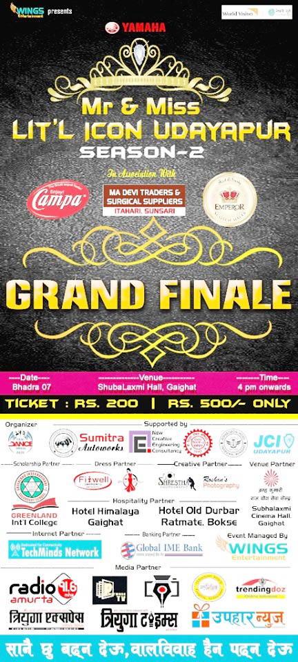 किशोरी तथा बालबालिकाहरुको प्रतिभालाई प्रस्फुटनको मुख्य उद्देश्यसहित उदयपुरमा जारी मिस्टर एण्ड मिस लिटिल आईकनको दोस्रो संस्करणअन्तर्गत ग्राण्ड फिनाले भदौ पहिलो साता हुने भएको छ । बिभिन्न ४० प्रतियोगी समभागी प्रतिस्पर्धाको अन्तिम प्रस्तुती यही भदौ ७ गते गाईघाटको शुभलक्ष्मी हलमा आयोजना हुने भएको हो ।