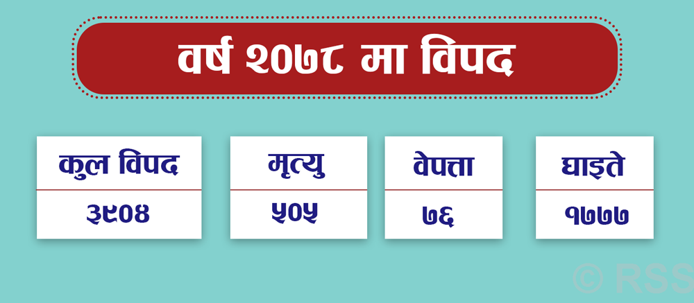 वर्ष २०७८ प्राकृतिक विपद्का हिसाबले अत्यन्त खराब स्थितिमा गुज्रियो । बाढी पहिराबाट मुलुकले नसोचेको मानवीय क्षति बेहोर्न पुग्यो । राष्ट्रिय विपद् जोखिम न्यूनीकरण तथा व्यवस्थापन प्राधिकरणका अनुसार वर्ष २०७८ मा देशभरमा विभिन्न प्रकृतिका तीन हजार ९०४ वटा विपत्ति आइलागे । ती विपद्मा परेर कूल ५०५ जनाले अकालमा ज्यान गुमाएका छन् । अझै ७६ जना हराइरहेका छन् भने एक हजार ७७७ जना घाइते भएका छन् ।