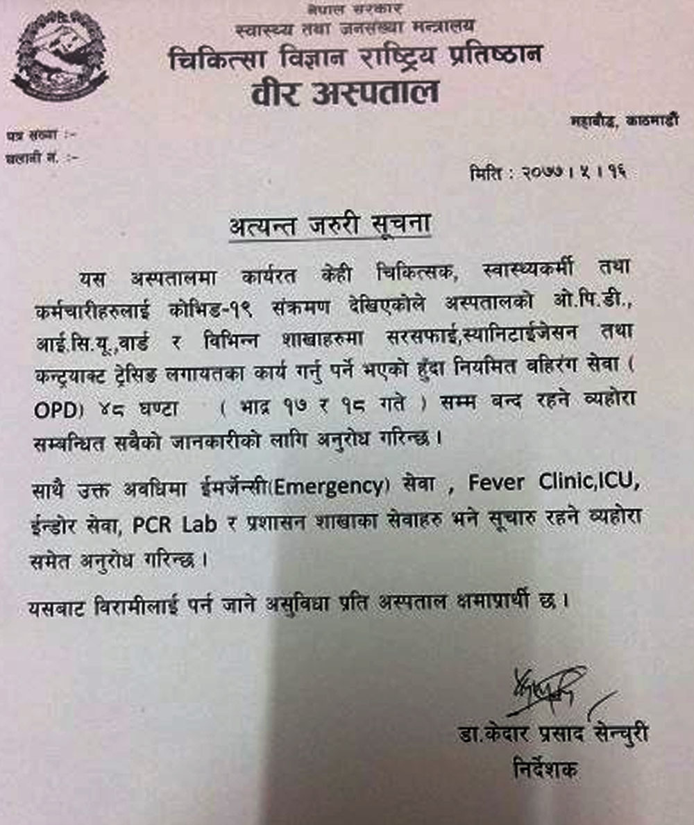काठमाण्डौको वीर अस्पतालमा कार्यरत १२ जना डक्र र १२ जना नर्ससति ७१ जनामा कोरोना संक्रमण पुष्टि भएपछि ओपीडी सेवा बन्द भएको छ ।