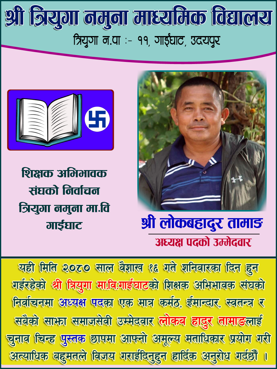 पूर्णपुष्टि, १५ वैशाख । यहि आउँदो १६ गते हुन गैरहेको त्रियुगा नमुना मा.वि गाईघाटका शिक्षक अविभावक संघको निर्वाचनमा लोक वहादुर तामाङले अध्यक्ष पदको उम्मेवादरी दिएका छन् । त्रियुगा नगरपालिका १२ डिएमगेट निवासी तामाङले आफ्नो उम्मेदावरीको मुख्य कारण गुणस्तर शिक्षा र पारदर्शीता सँगै अभिभावक, शिक्षक, विद्यार्थी सबैको हितका लागि रहेको जनाए । बिभिन्न क्षेत्रहरुमा लामो समय काम गर्दै हरेक अनुभवहरुमा पोख्त तामाङले अब विद्यार्थी, शिक्षक, अविभावकहरुको नेतृत्व गर्ने जनाए । तामाङले आफुले यस विद्यालयको नेतृत्व गर्न पाएमा विद्यालयको नियमित पठनपाठन, शैक्षिक गुणस्तर, शैक्षिक शुल्क र सेवा सुविधाहरुलाई सर्वशुलभ र पारदर्शी, नियमित अनुगमन, मुल्यांकन, भेटघाट तथा अन्तरक्रिया, विद्यार्थी, अभिभावक र शिक्षकलाई जवाफदेहिता लगायतका समस्यालाई सहज गराउने जनाए । तामाङ संग दुई प्रतिस्पर्धिहरु समेत अध्यक्ष पदमा उम्मेदवारी दिएका छन् । उनले किताव चुनाव चिन्ह लिएर उम्मेदवारी दिएका छन् ।