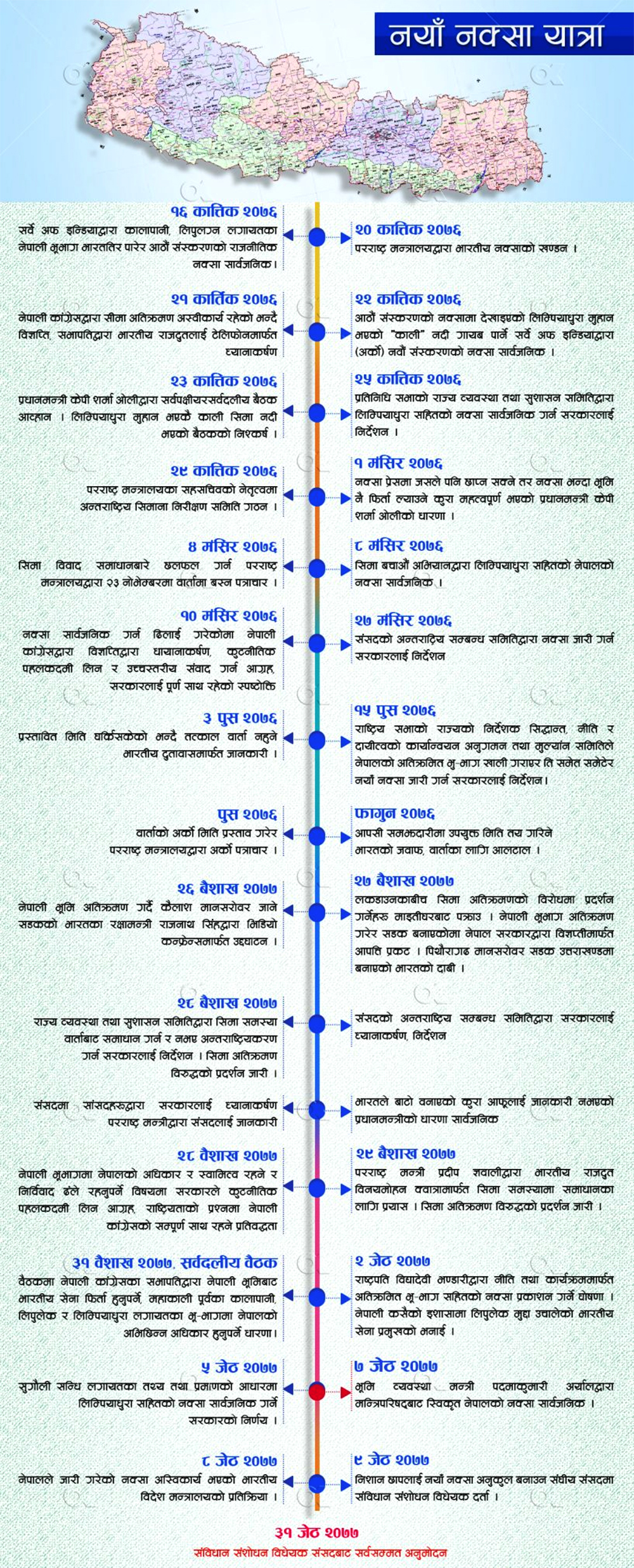 सरकारले जेठ ५ गते नयाँ नक्सा पास गरेको थियो भने ७ गते सार्वजनिक गरेको थियो । नयाँ नक्साअनुसार निशान छाप परिर्वतन गर्न ९ गते नै संसद सचिवालयमा संविधान संशोधन विधेयक दर्ता भएको थियो ।
