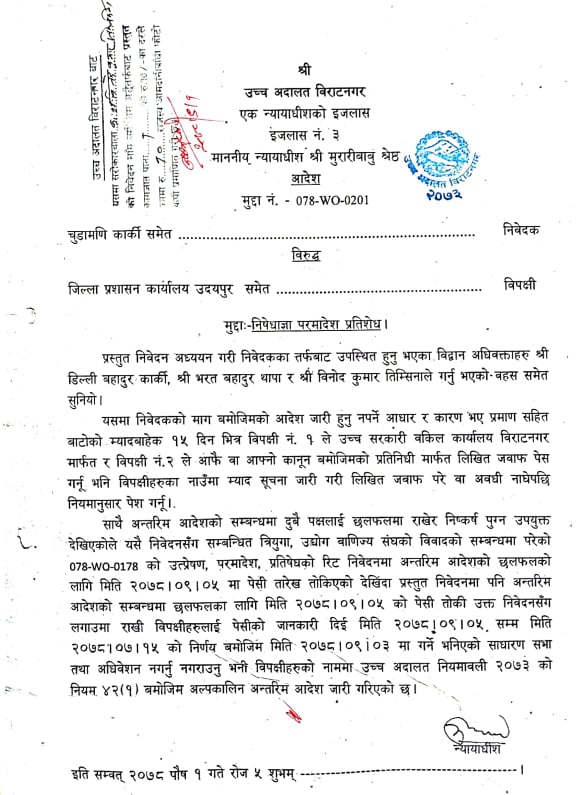उच्च अदालत विराटनगरबाट अल्पकालिन अन्तरिम आदेश जारी गर्दै साधारणसभा रोक्न भनेको हो । चुडामणी कार्कीको निवेदनमा उच्च अदालतले पुस १ गते अन्तरिम आदेश जारी गरेको हो ।