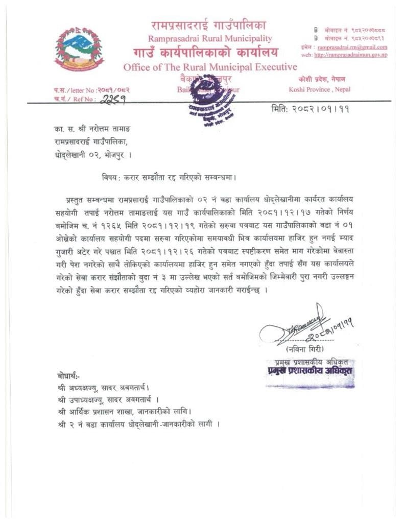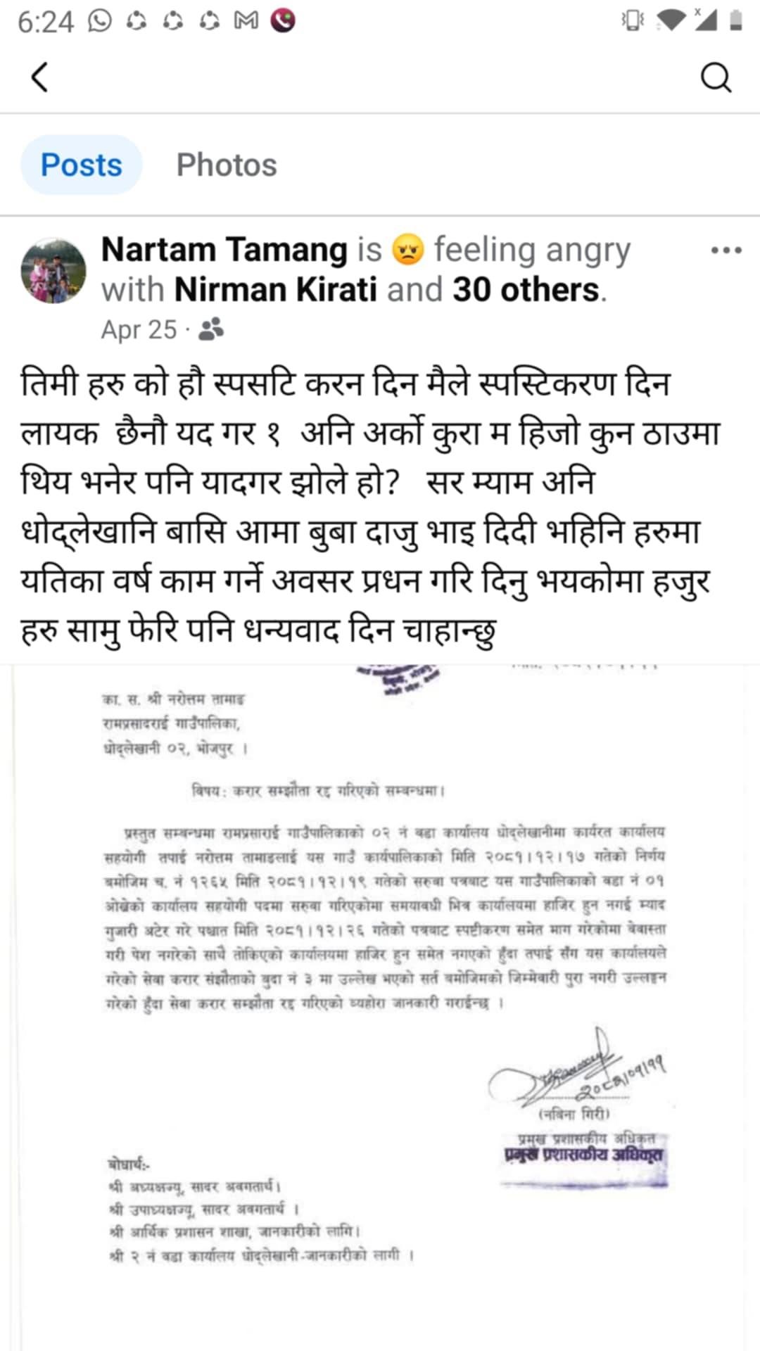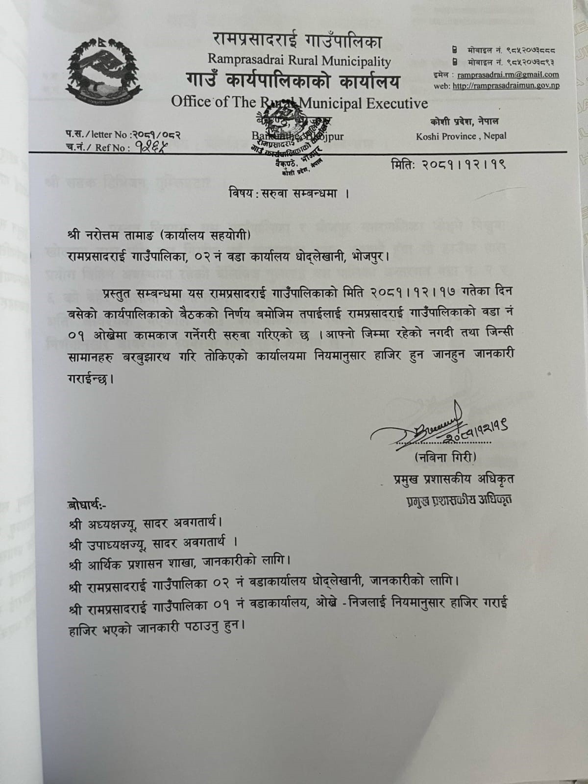 कार्यलय सहयोगी भएर कार्यलय समयमा चोकमा क्यारेमबोर्ड खेल्ने, वडाध्यक्षको मर्यादा नगर्ने भन्दै पटक पटक वडाध्यक्ष तामाङले कार्यलय सहयोगी सरुवाका लागि गाउँपालिकामा कुरा राख्छन् । सोही बमोजिम कार्यपालिकाको २०८१ चैत्र १७ गतेको बैठकले ३ वडा सचिव २ कार्यलय सहायक र १ कार्यालय सहायोगीको सरुवा गर्ने निर्णय गर्छ । जस अनुसार वडा नं १ ओख्रेका कार्यालय सहायक डम्बर भुजेललाई वडा नं ५ मानेभञ्याङ, मानेभञ्याङका कार्यलया सहायक तिर्थबहादुर तामाङलाई वडा नं २ धोद्लेखानी र वडा नं २ का कार्यालय सहयोगी नरोत्तम तामाङलाई वडा नं १ ओख्रेमा आन्तरिक सरुवा गरिएको थियो । तर कार्यपालिकाको पत्रलाई वेवास्ता गर्दै नरोत्तम तामाङले वडामा हाजिर गर्न नमाने पछि फेरी प्रमुख प्रशासकिय अधिकृत नविना गिरिले स्पस्टिकरणका लागि पत्र लेख्छन् । २०८१ चैत्र २६ गते स्पष्टिकरण मागिएपछि गाउँपालिका अध्यक्ष थामबहादुर राई निर्माणलेसमेत हाललाई स्पप्टिकरण दिएर तोकिएको वडामा हाजिर हुने र केही समय पछि फेरी यथास्थानमा सरुवा मिलाउने आश्वासन दिन्छन् । स्पष्टिकरणका लागि तयार भएर गाउँपालिका अध्यक्षको च्याम्बरबाट निस्किएका नरोत्तमले स्मष्टिकरण नदिएर उल्टै गाउँपालिकाले स्पष्टिकरण लिने हैसियत नराख्ने भन्दै सामाजिक सञ्जाल फेसबुकमा स्पष्टिकरण मागिएको पत्र सार्वजानिक गर्छन् । तोकिएको समयमा स्पष्टिकरण दिन नमानेपछि कार्यपालिकाको वैठकले नरोत्तमको करार सेवा अवधि नविकरण गरेको छैन । नरोत्तम भने त्यतिमै रोकिएका छैनन् गाउँपालिकाका अध्यक्ष र उपाध्याक्षसंगै प्रमुख प्रशासकिय अधिकृतविरुद्ध फेसबुकमा अमर्यादित कमेन्ट लगतार गरिरहेका छन् । आगामी निर्वाचनमा देखाई दिने धम्किसंगै प्रमुख प्रशासकिय अधिकृतलाई समेत अपठ्यारोमा पार्ने मनासायका स्टाटस धम्कि नरोत्तमले दिने गरेका छन् ।