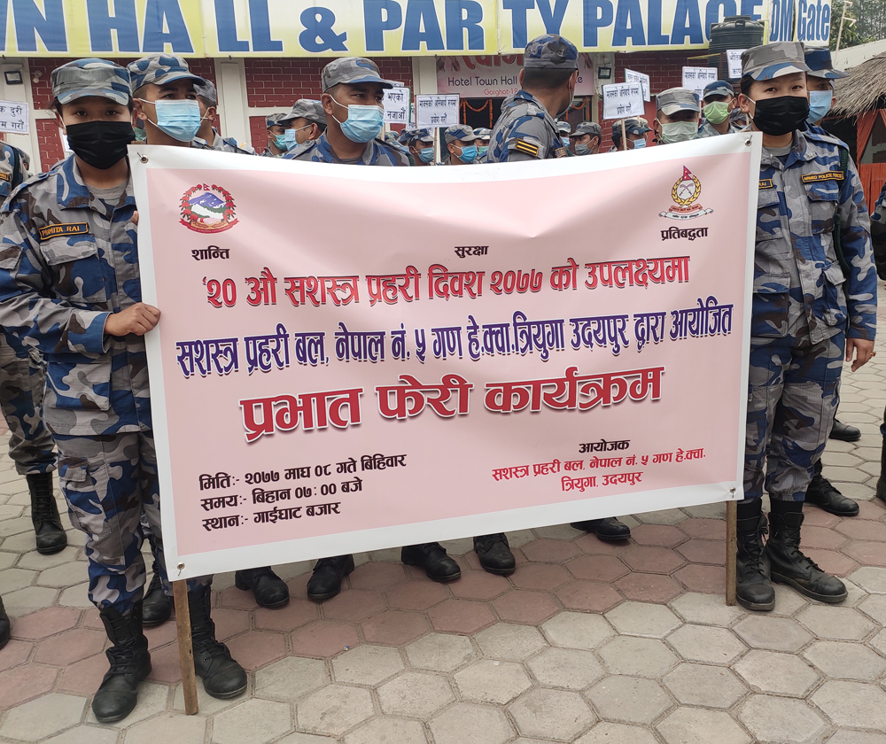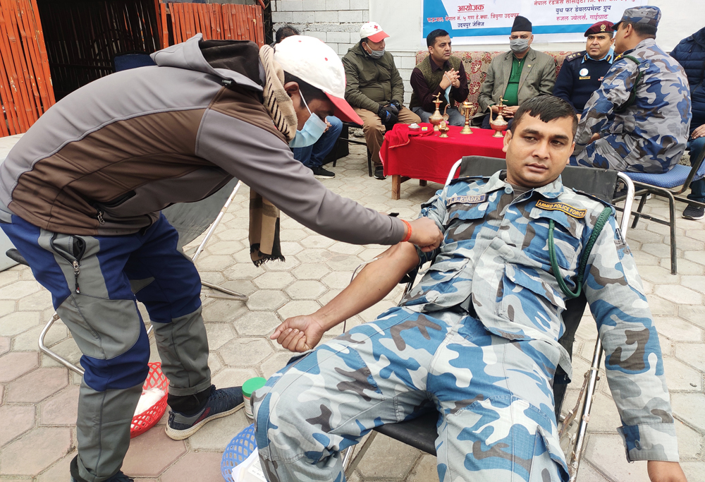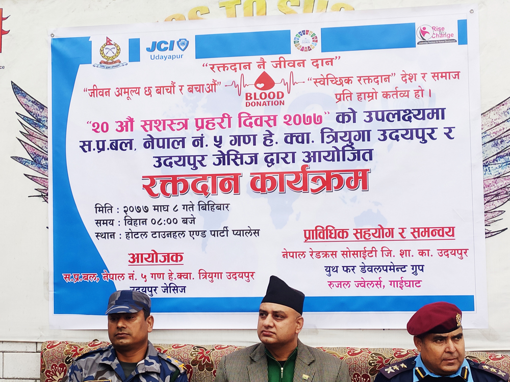 २० औँ सशस्त्र प्रहरी दिवसको अवसरमा उदयपुरमा रक्तदान कार्यक्रमको आयोजना गरिएको छ । देशव्यापी रुपमा मनाईरहेको दिवस उदयपुरमा बिभिन्न कार्यक्रम प्रभातफेरी, रक्तदान, माल्याणर्पण जस्ता कार्यक्रम सहित दिवस मनाइएको हो । सशस्त्र प्रहरी वल नेपाल नं. ५ गण हेक्वा उदयपुरको आयोजनामा प्रभातफेरी र्याली सहित रक्तदान कार्यक्र गरिएको छ । रक्तदान जिवन दान भन्दै शान्ति, शुरक्षा र प्रतिबद्धताका साथ रक्तदानको कार्यक्रम गरिएको सशस्त्र प्रहरी वल नेपाल नं ५ गण हेक्वा उदयपरका एसपी सुधिर सुवेदीले बताउनुभयो ।